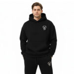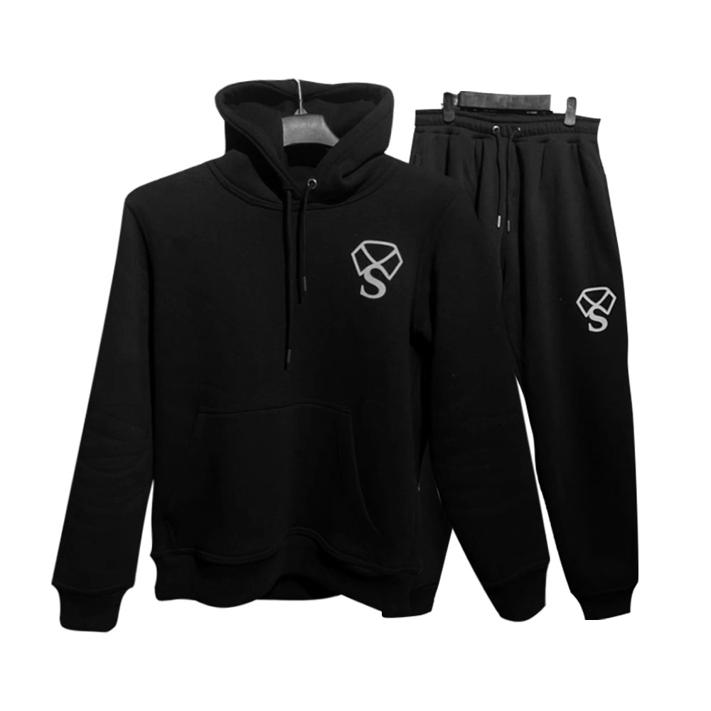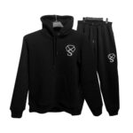 This stylish black tracksuit set includes a hoodie and matching jogger pants, designed for both comfort and a modern look. Made from soft, durable fabric, it is perfect for everyday wear, workouts, or casual outings. The hoodie features a front kangaroo pocket and adjustable drawstring, while the joggers come with an elastic waistband and cuffed ankles for a relaxed yet smart fit. The minimal “S” logo print adds a clean, premium touch to the overall design.