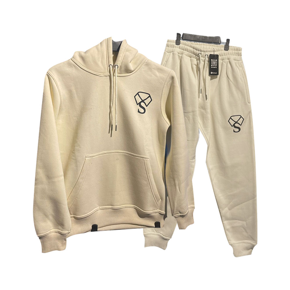 This stylish Cream White tracksuit set includes a hoodie and matching jogger pants, designed for both comfort and a modern look. Made from soft, durable fabric, it is perfect for everyday wear, workouts, or casual outings. The hoodie features a front kangaroo pocket and adjustable drawstring, while the joggers come with an elastic waistband and cuffed ankles for a relaxed yet smart fit. The minimal “S” logo print adds a clean, premium touch to the overall design.